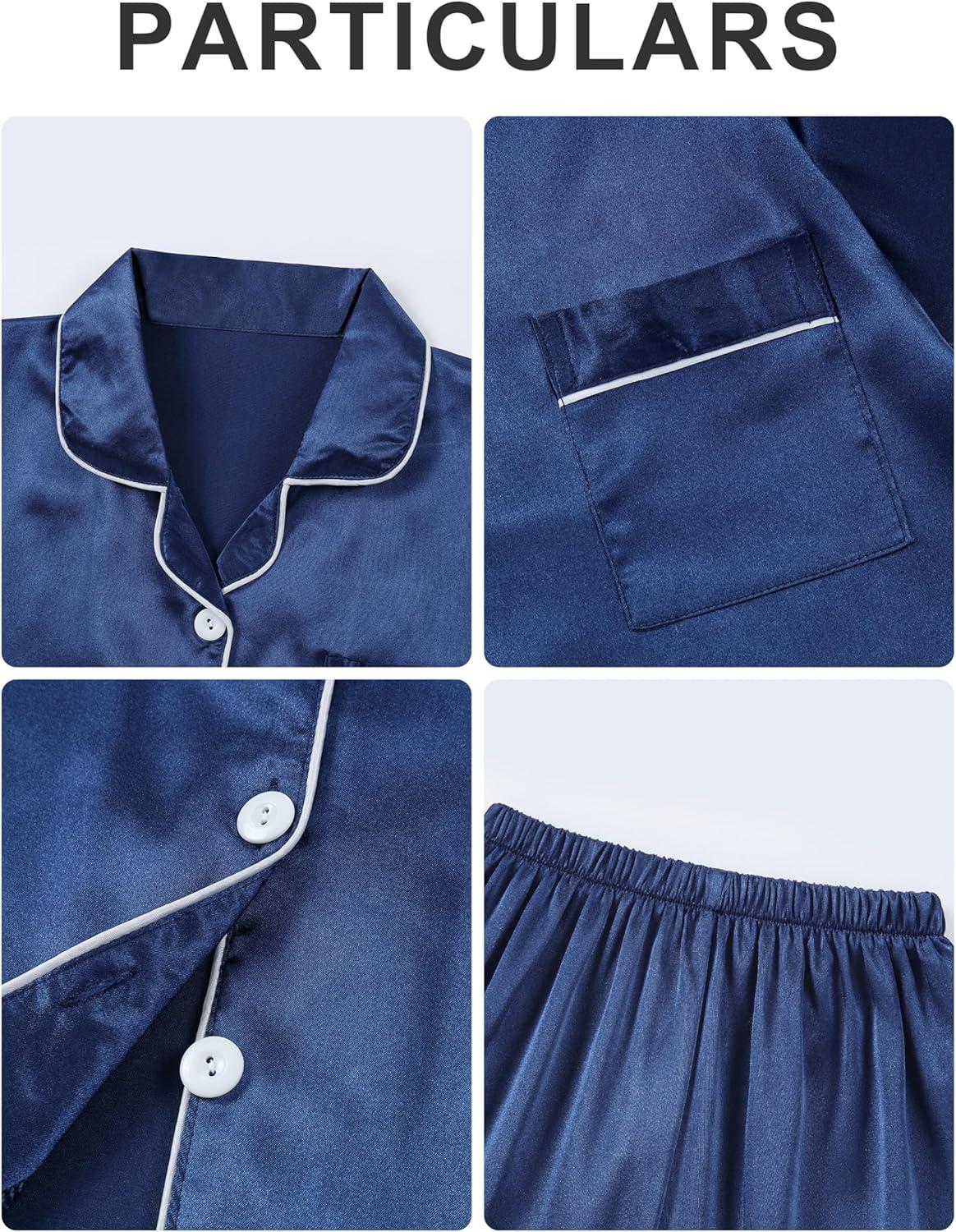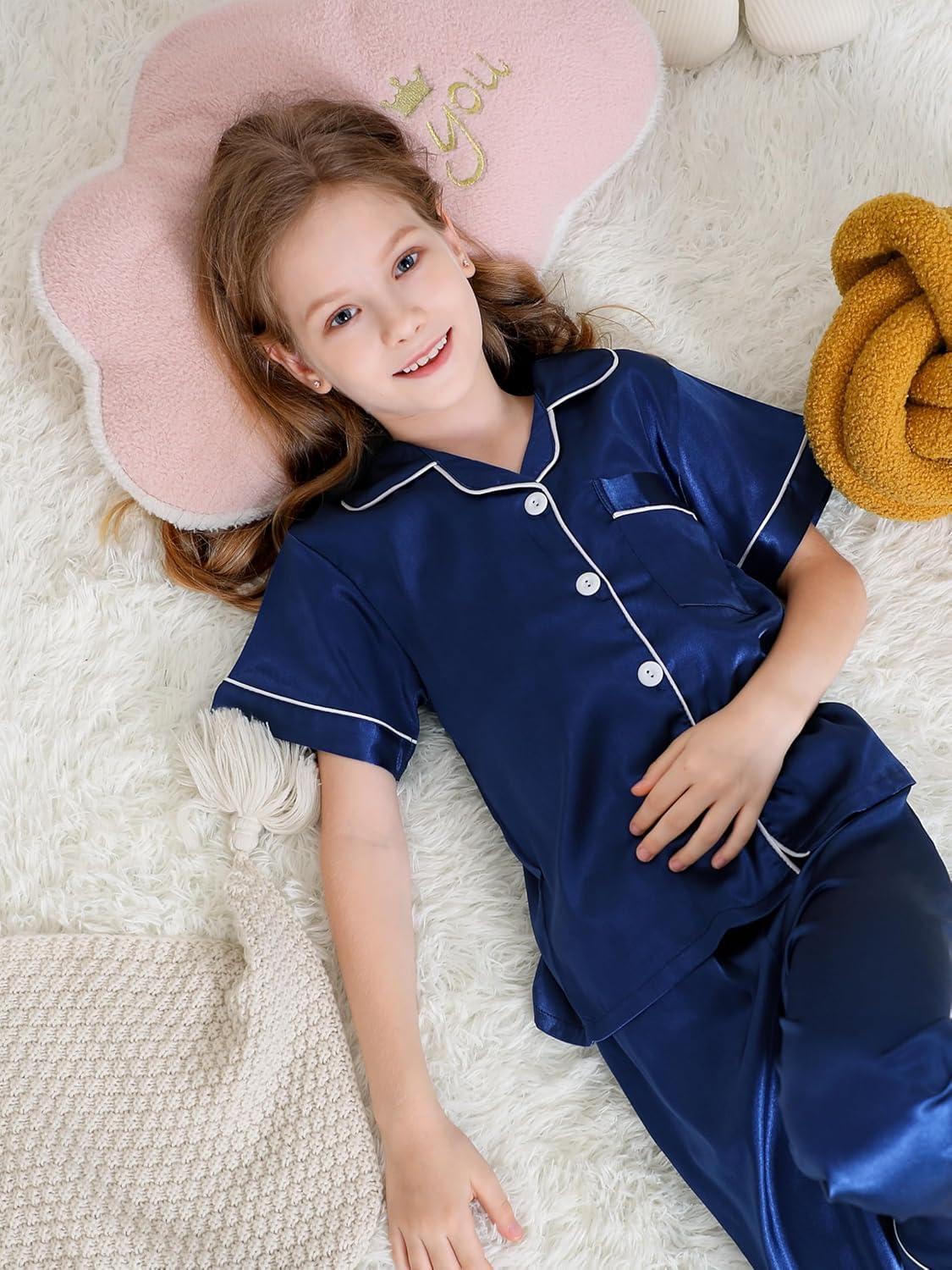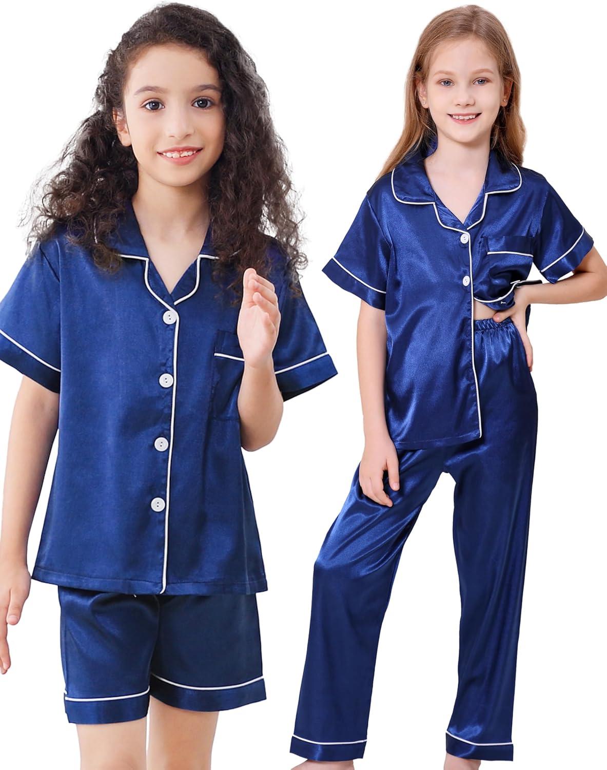 DIPUG 3 Piece Girls Silk Pajamas Set Soft Satin PJs Sleepwear for Comfortable Nights(Navy)