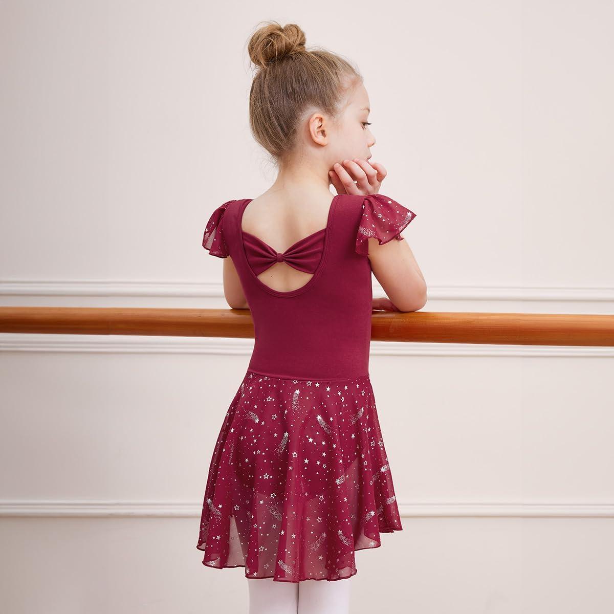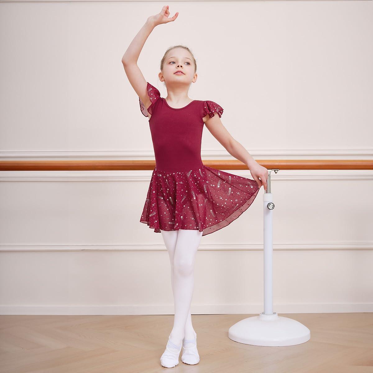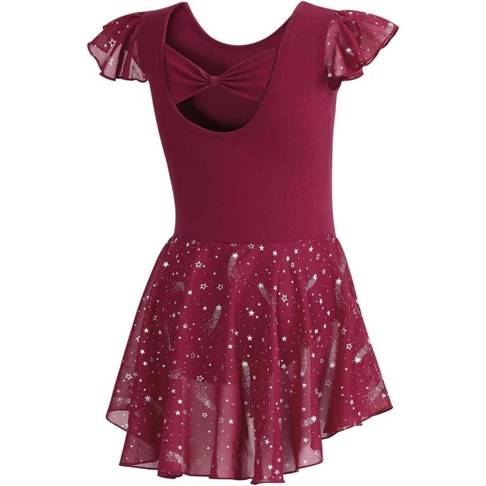 DIPUG Girls Ballet Leotards Toddler Shiny Dance Leotard Dresses with Ruffle Sleeve(Burgundy)