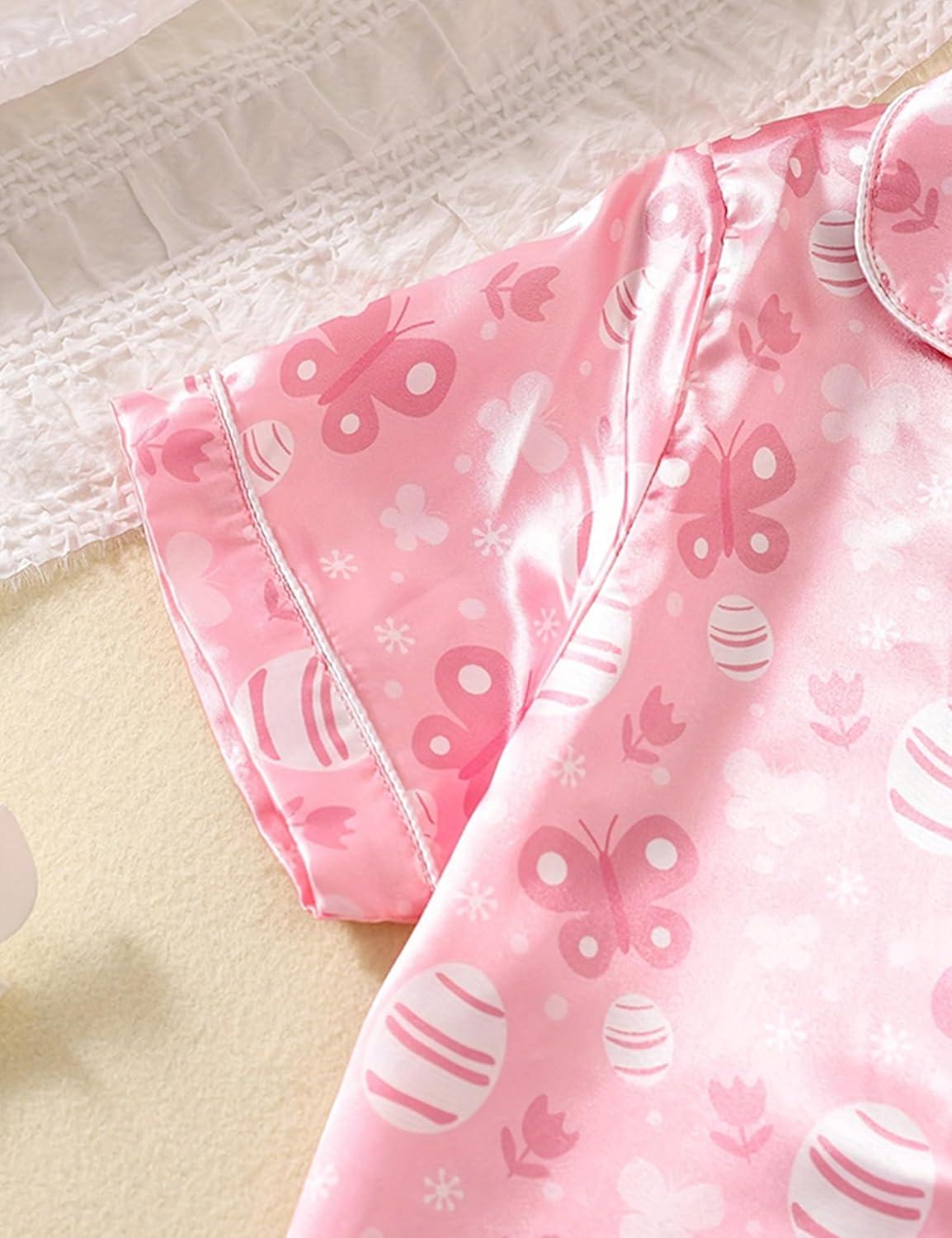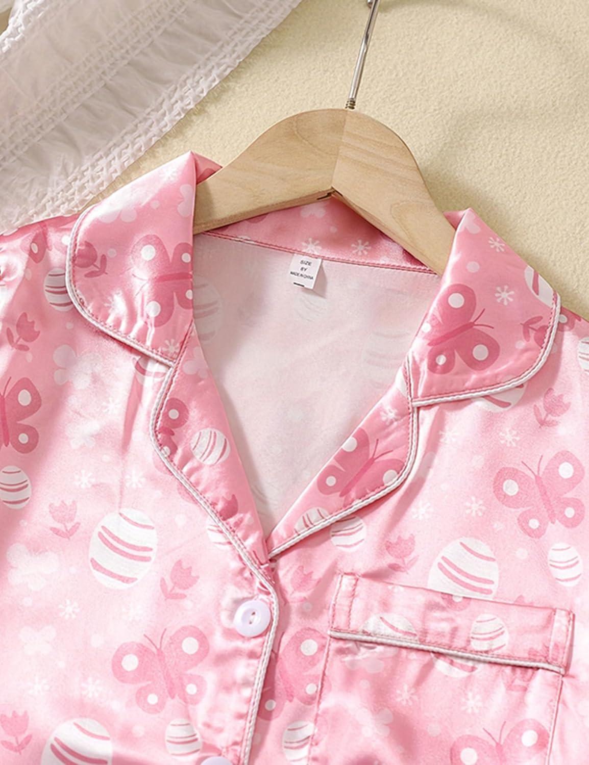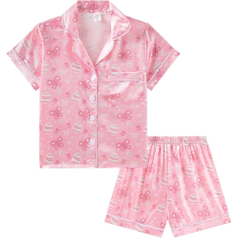 DIPUG Girls Pajamas Satin Pajama Set Silk Pjs Short Sleeve Sleepwear(Pink Butterfly)