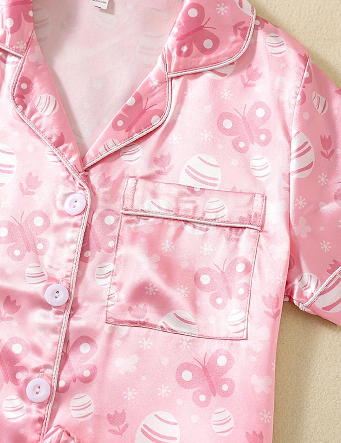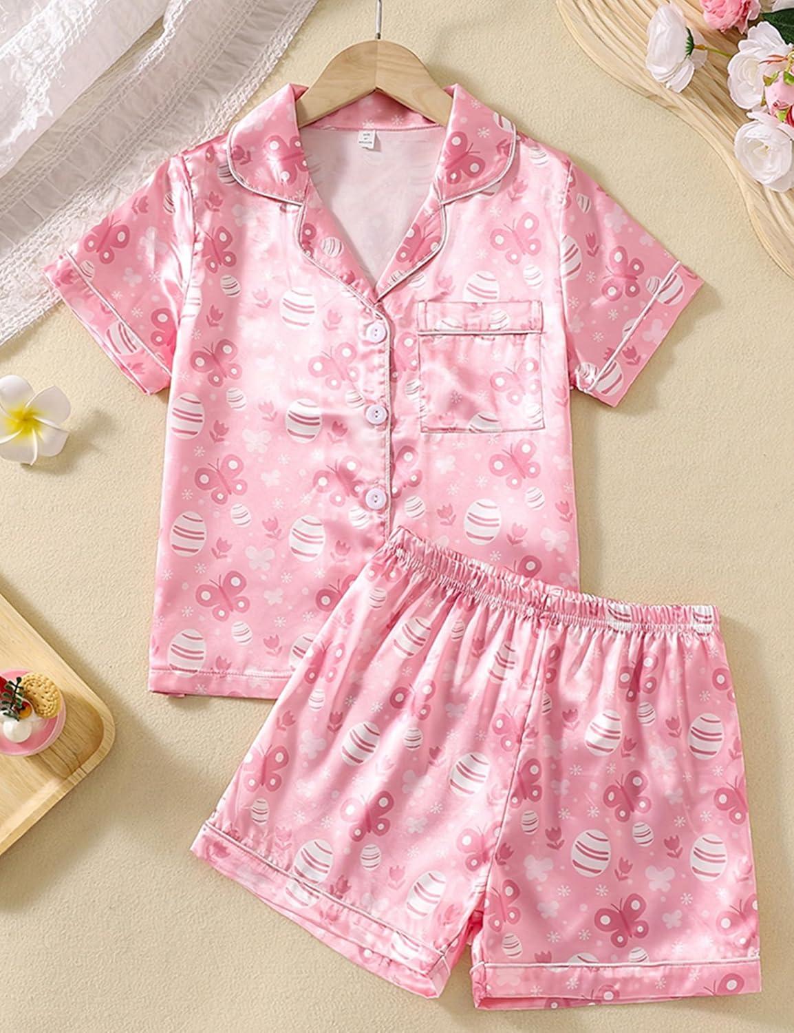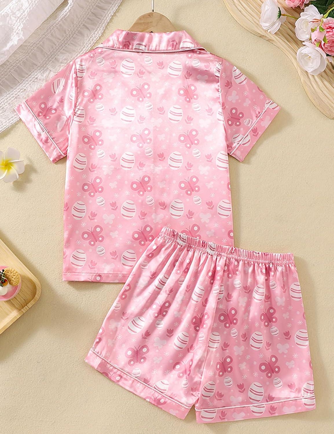 DIPUG Girls Pajamas Satin Pajama Set Silk Pjs Short Sleeve Sleepwear(Pink Butterfly)