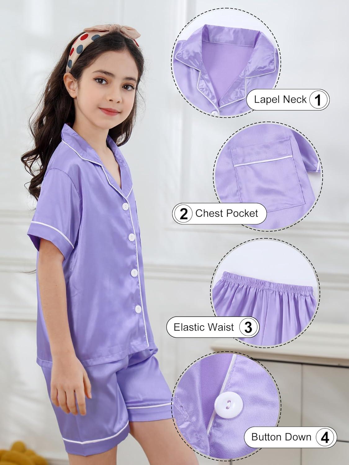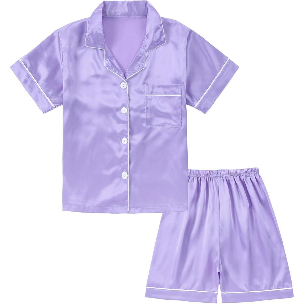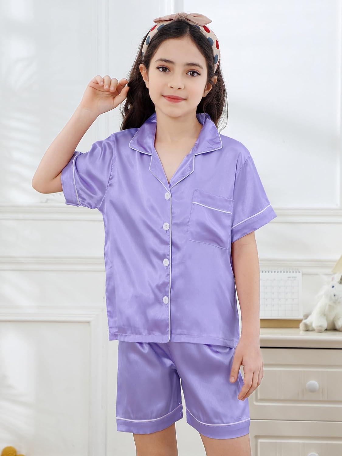 DIPUG Girls Silk Pajamas Set Satin Pjs for Kids Comfortable Nights Sleepwear(Light Lavender)